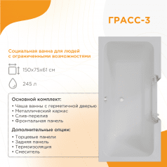 Конструкция продумана для полной герметичности и удобства. Дверца оснащена эластичным уплотнителем, предотвращающим малейшие протечки, и может быть навешена для открывания как вправо, так и влево, что позволяет идеально вписать ванну в планировку санузла. Грасс 3 — оптимальное сочетание медицинского функционала, обеспечивающего безопасность и самостоятельность.