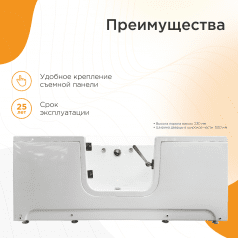 Медицинская ванна Radomir (Радомир) Грасс 3 — специализированное оборудование, созданное для безопасного и удобного купания людей с ограниченной мобильностью и пожилых пользователей. Её отличительная особенность — встроенная герметичная дверца, которая делает высокий бортик полностью доступным, обеспечивая лёгкий заход и выход без посторонней помощи.