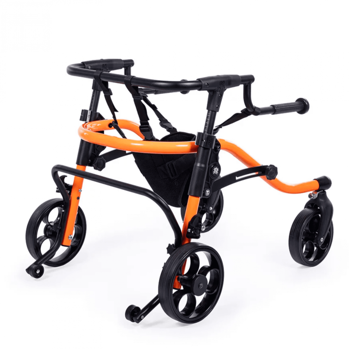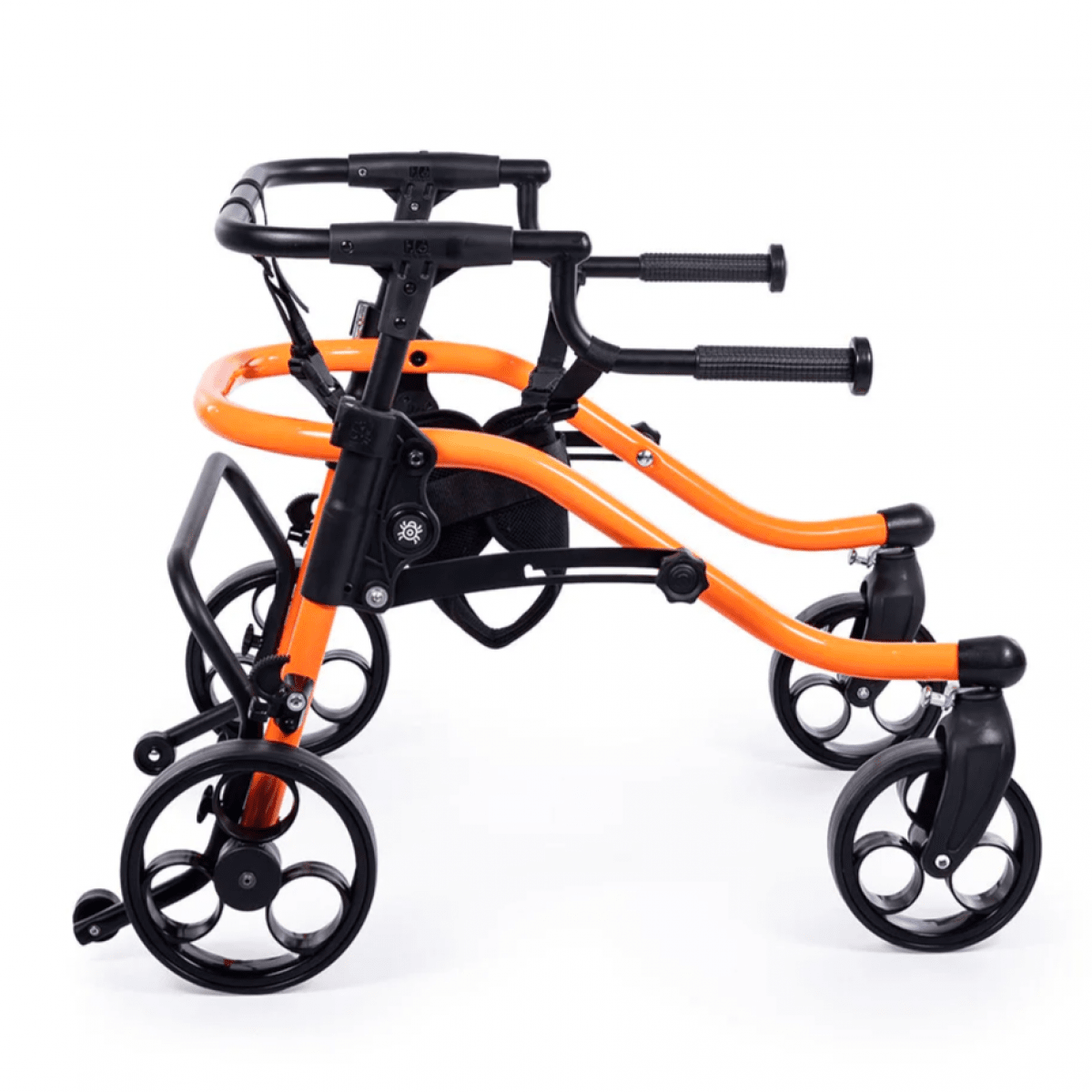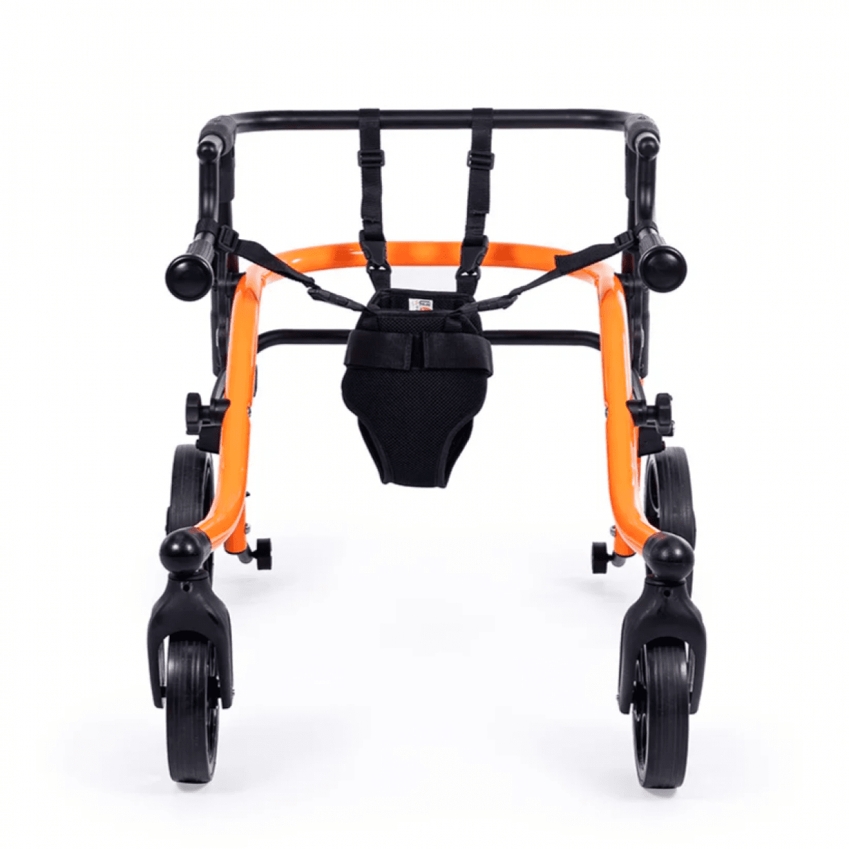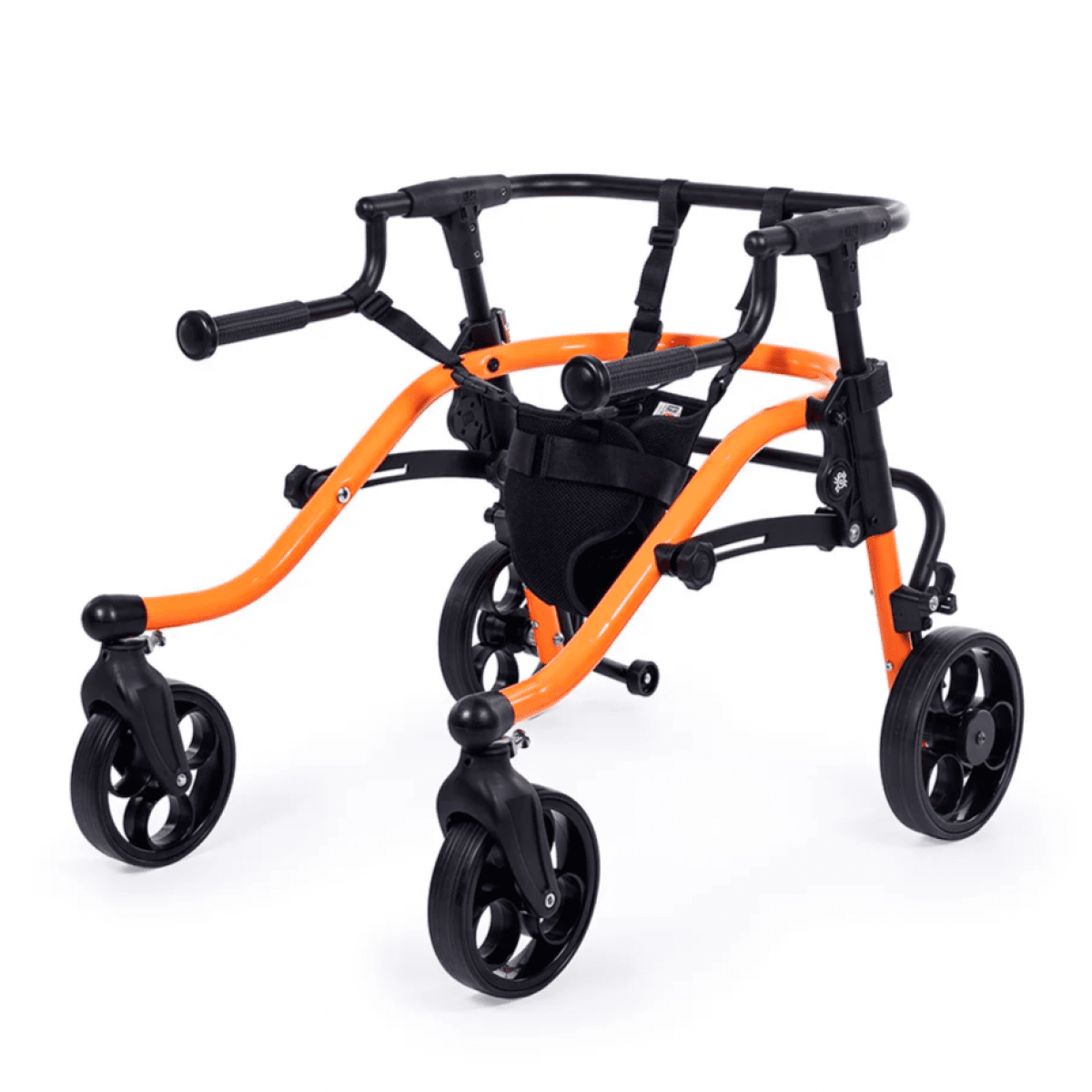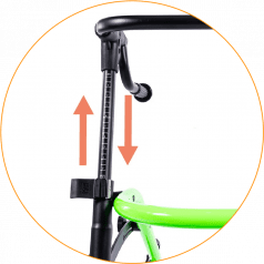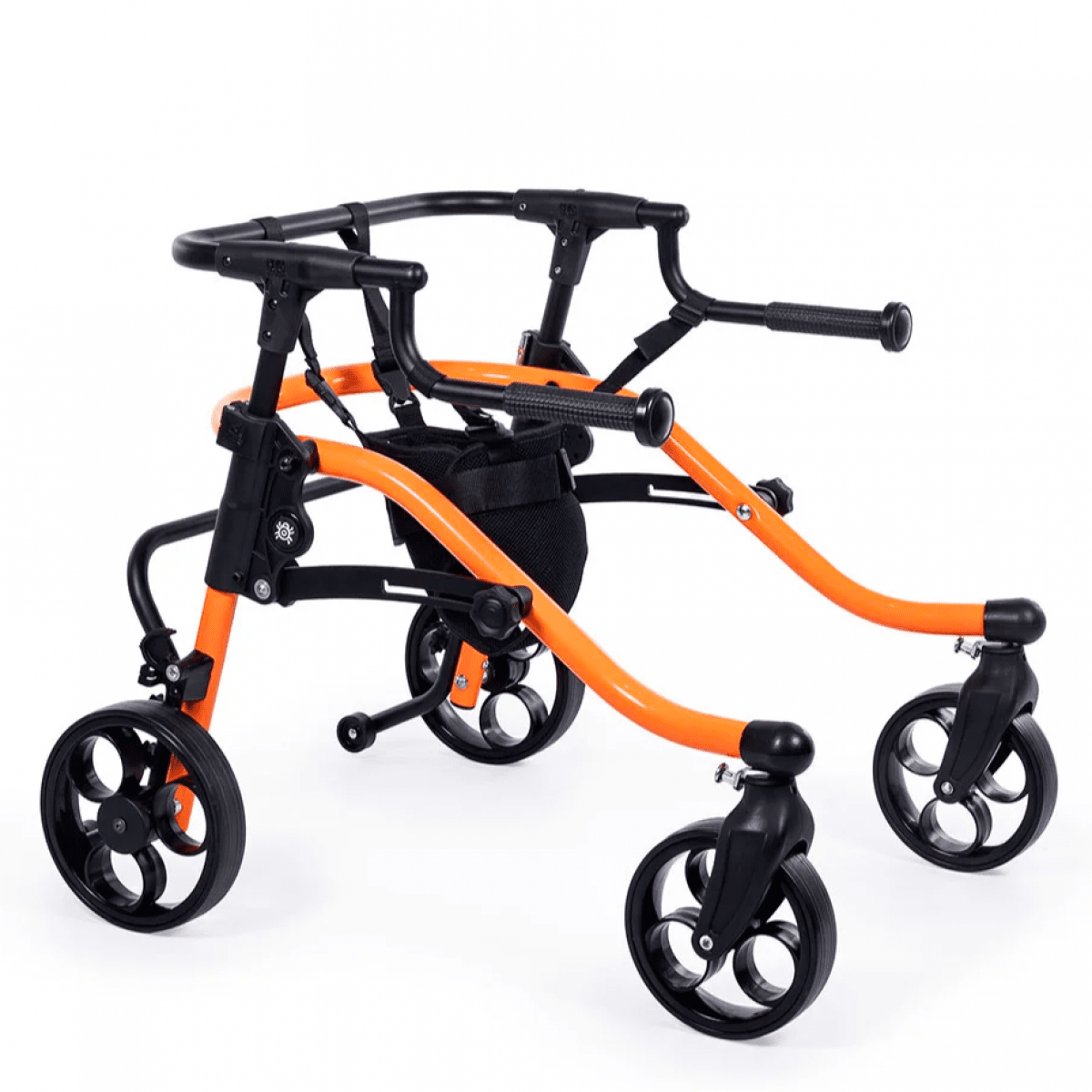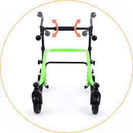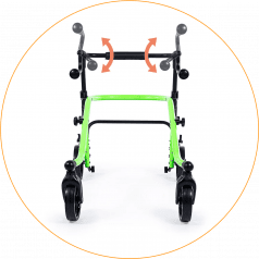 Продуманная колёсная система помогает контролировать движение. Передние колёса фиксируются по направлению, помогая ребёнку двигаться увереннее и спокойнее. Задние колёса оснащены регулируемым замедлителем — скорость движения можно настроить под возможности пользователя. Дополнительная защита от отката назад повышает безопасность и даёт ощущение надёжности во время занятий.