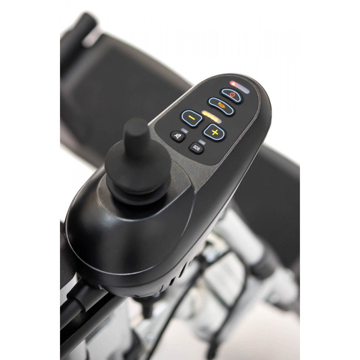 Контролер с джойстиком для управления может быть расположен как с правой, так и с левой стороны подлокотника. На контроллере также располагаются кнопки для переключения скоростных режимов, вызова звукового сигнала и активации функции SOS.