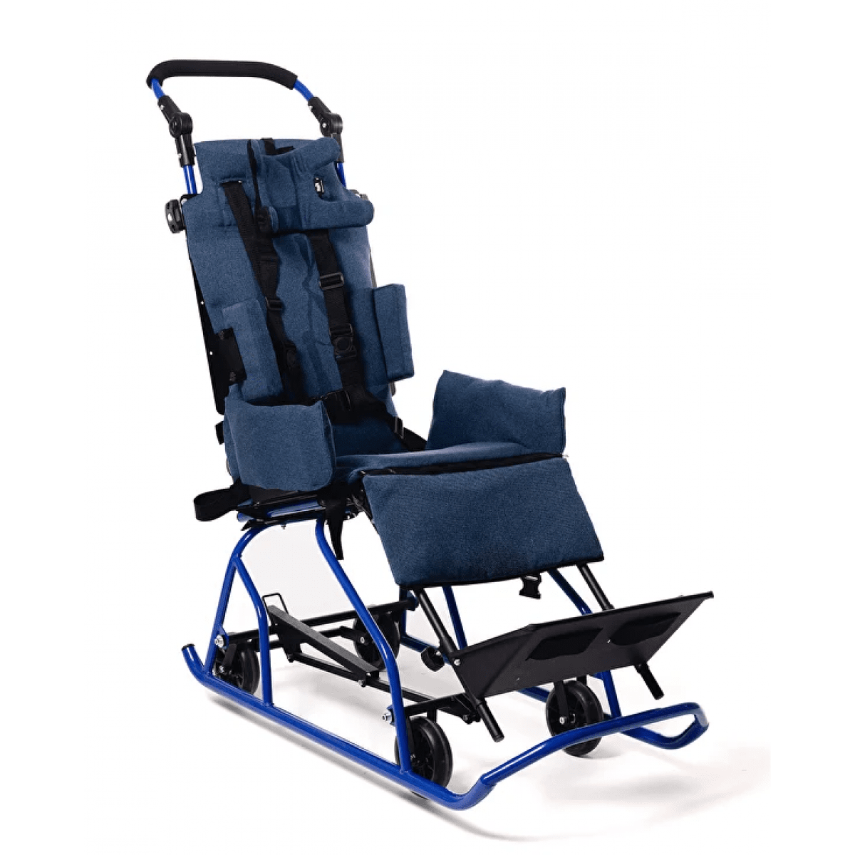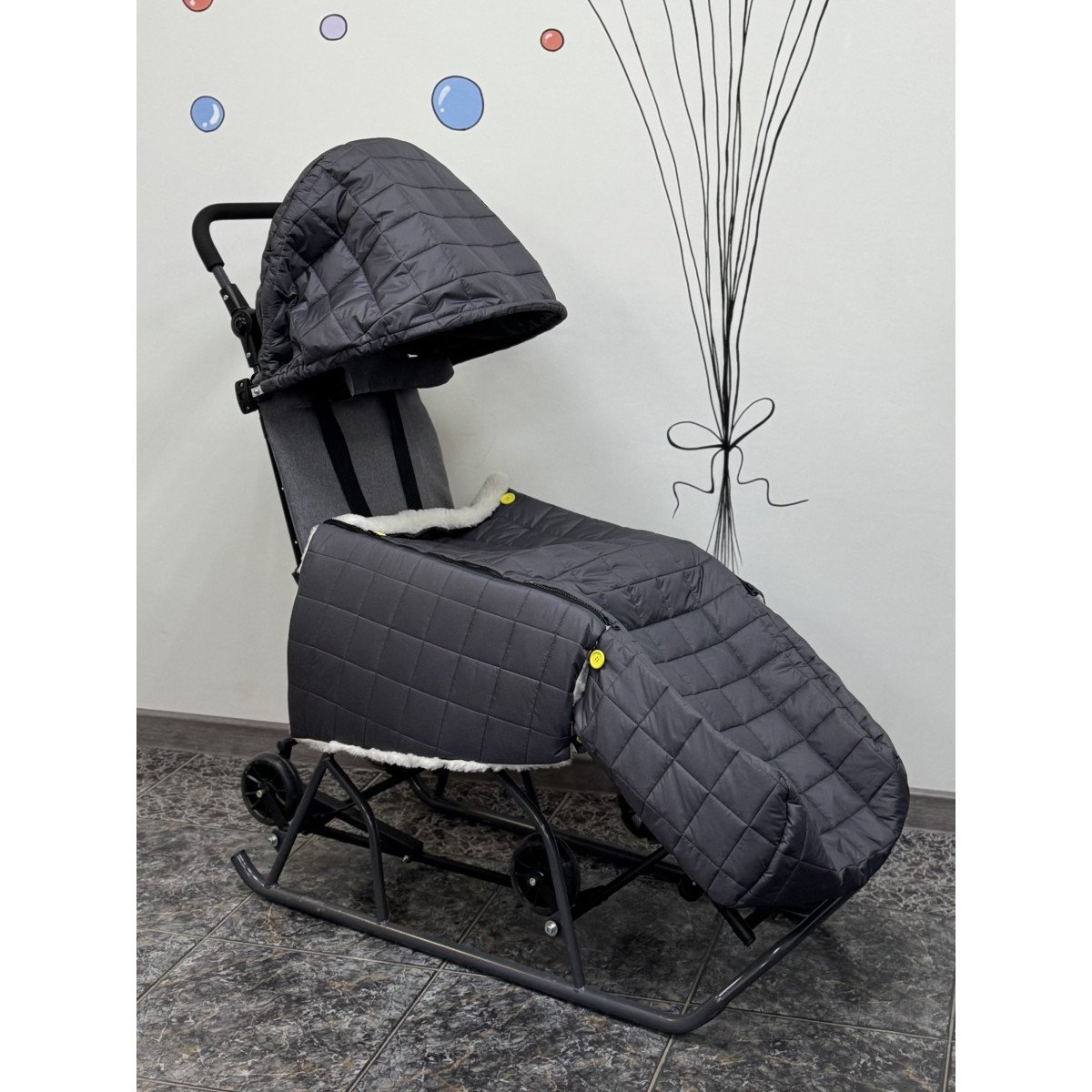 Конструкция санок продумана до мелочей: регулируемая спинка и подножка позволяют подобрать удобное положение для ребёнка. Чехол изготовлен из прочного влагозащитного материала болонья, который надёжно защищает от ветра и осадков. Внутренний подклад из искусственного меха (овчины) сохраняет тепло и создаёт уют даже в морозную погоду.