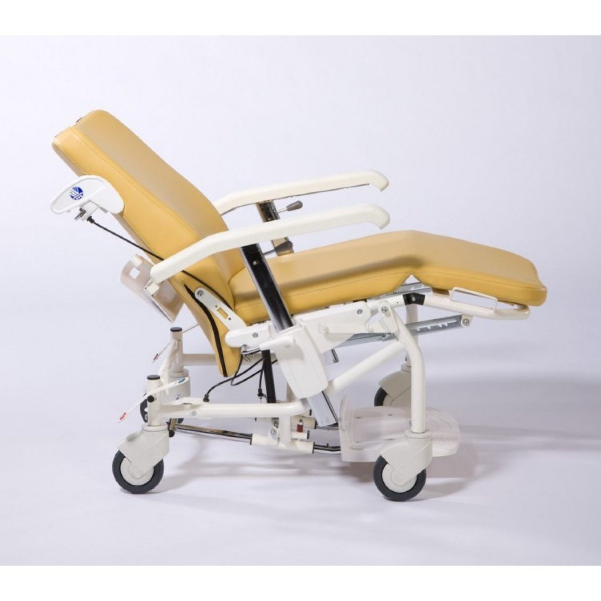 Кресло оснащено регулируемыми по высоте удлинёнными пластиковыми подлокотниками и выдвижной подножкой. Угол наклона спинки регулируется до 30° как сопровождающим лицом, так и самим пользователем с помощью газовых пружин. Сиденье можно наклонить на 12° назад и 3° вперёд для комфортного размещения. Специальная обивка из кожзаменителя сочетает прочность, приятные тактильные ощущения и адаптацию к форме тела.