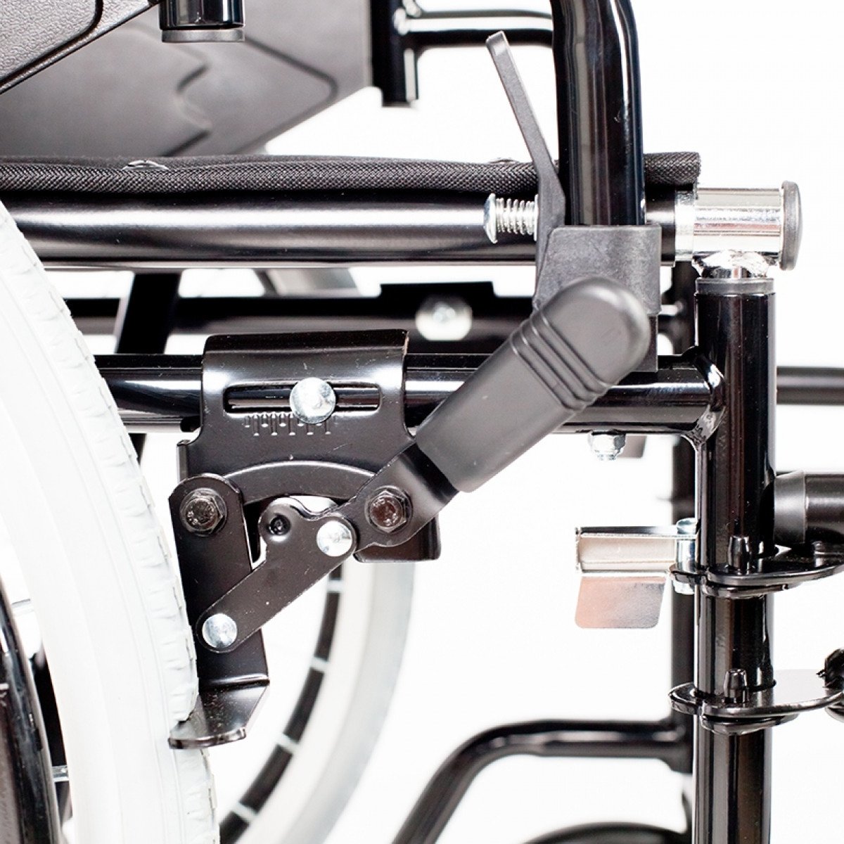 Коляска складывается без инструментов — достаточно откинуть подножки и потянуть за середину сиденья. Складная спинка дополнительно уменьшает габариты при транспортировке. Откидные подлокотники с мягкой опорой и жёсткой боковой защитой делают посадку удобнее и обеспечивают дополнительную устойчивость.