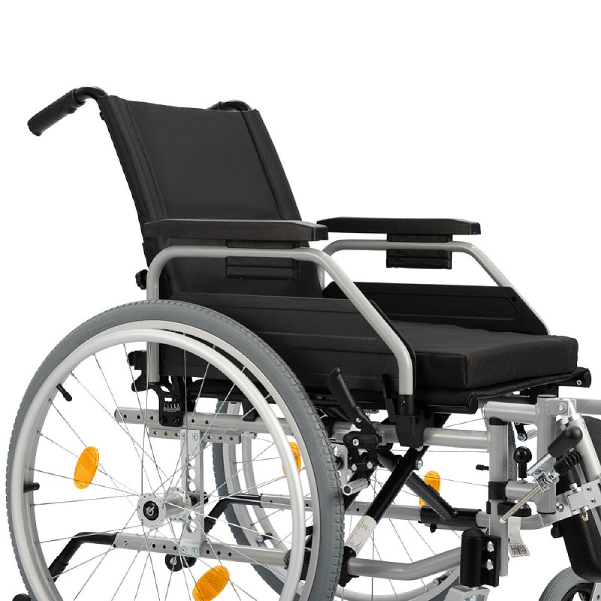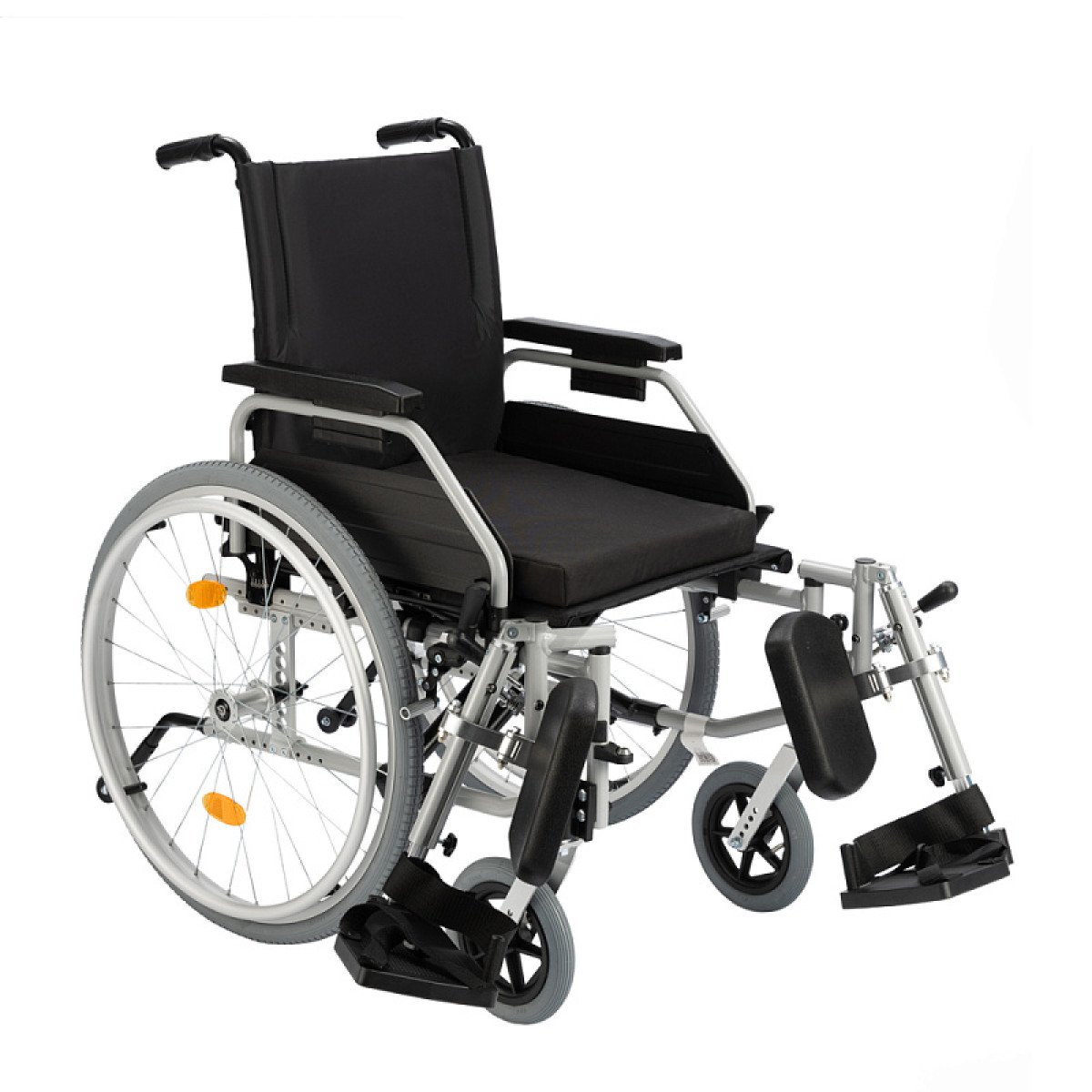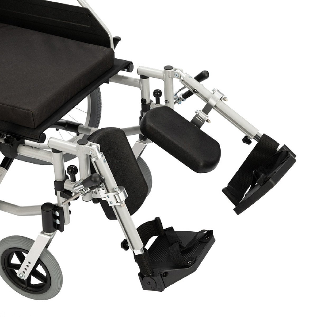 Подножки настраиваются по длине и углу наклона, дополнены мягкими опорами для голени — это важно при восстановлении после травм нижних конечностей. Подлокотники регулируются по высоте, откидываются или снимаются, облегчая пересаживание.