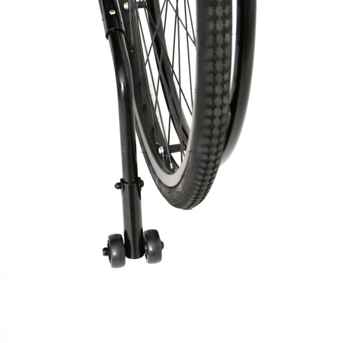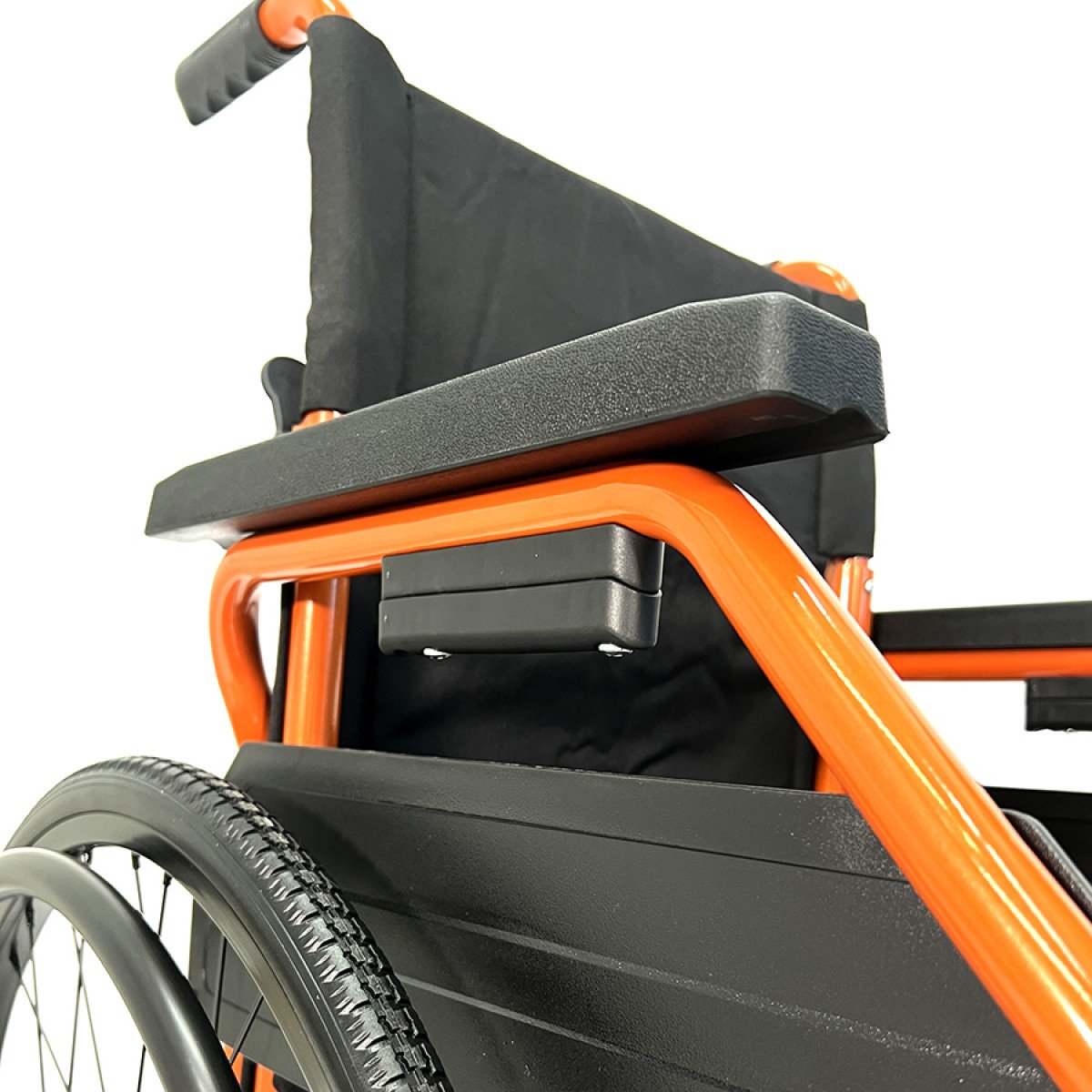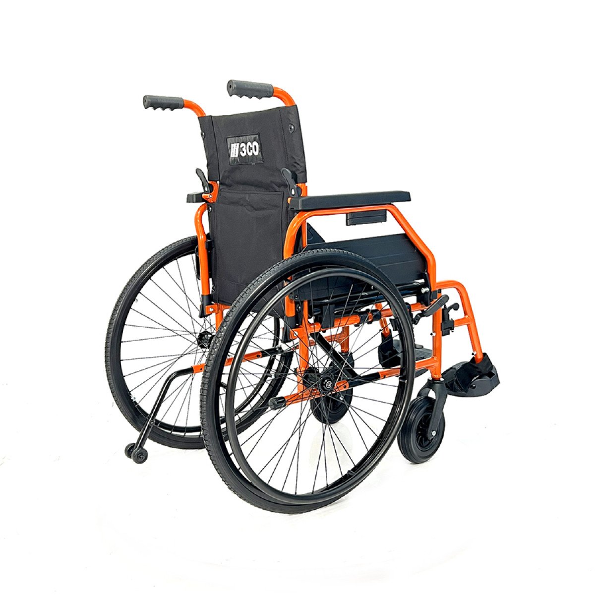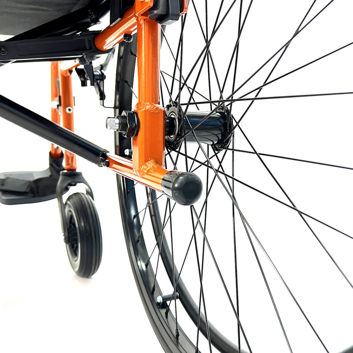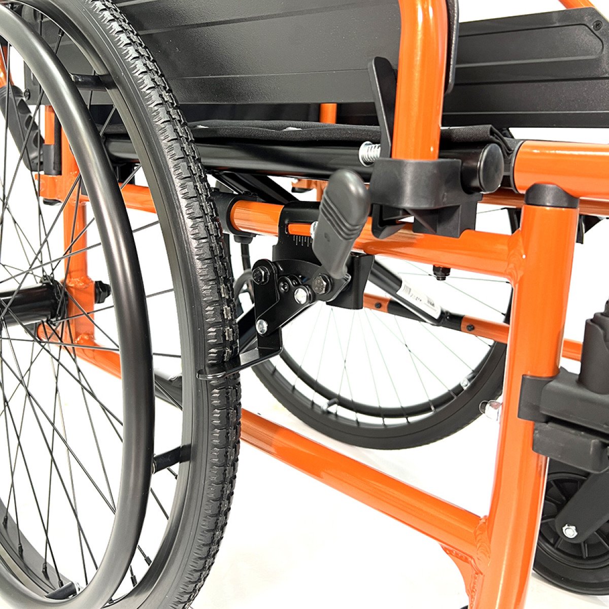 Задние колёса — быстросъёмные, с кнопочной фиксацией, доступны в вариантах с цельнолитыми или пневматическими шинами. Передние колёса обеспечивают манёвренность, а вся система колёс помогает уверенно передвигаться по разным покрытиям. Стояночные тормоза регулируются по глубине установки, что повышает контроль и безопасность при остановке.