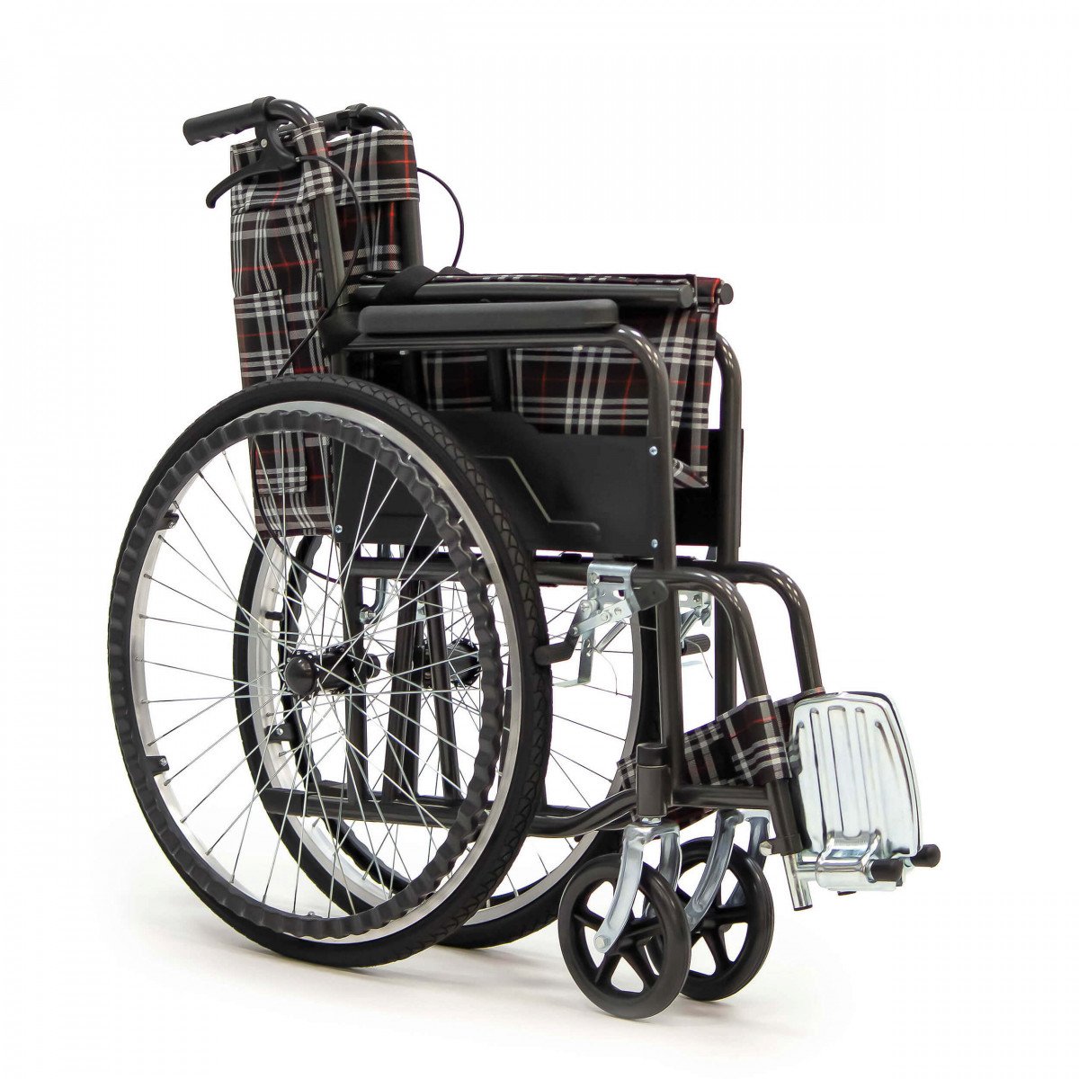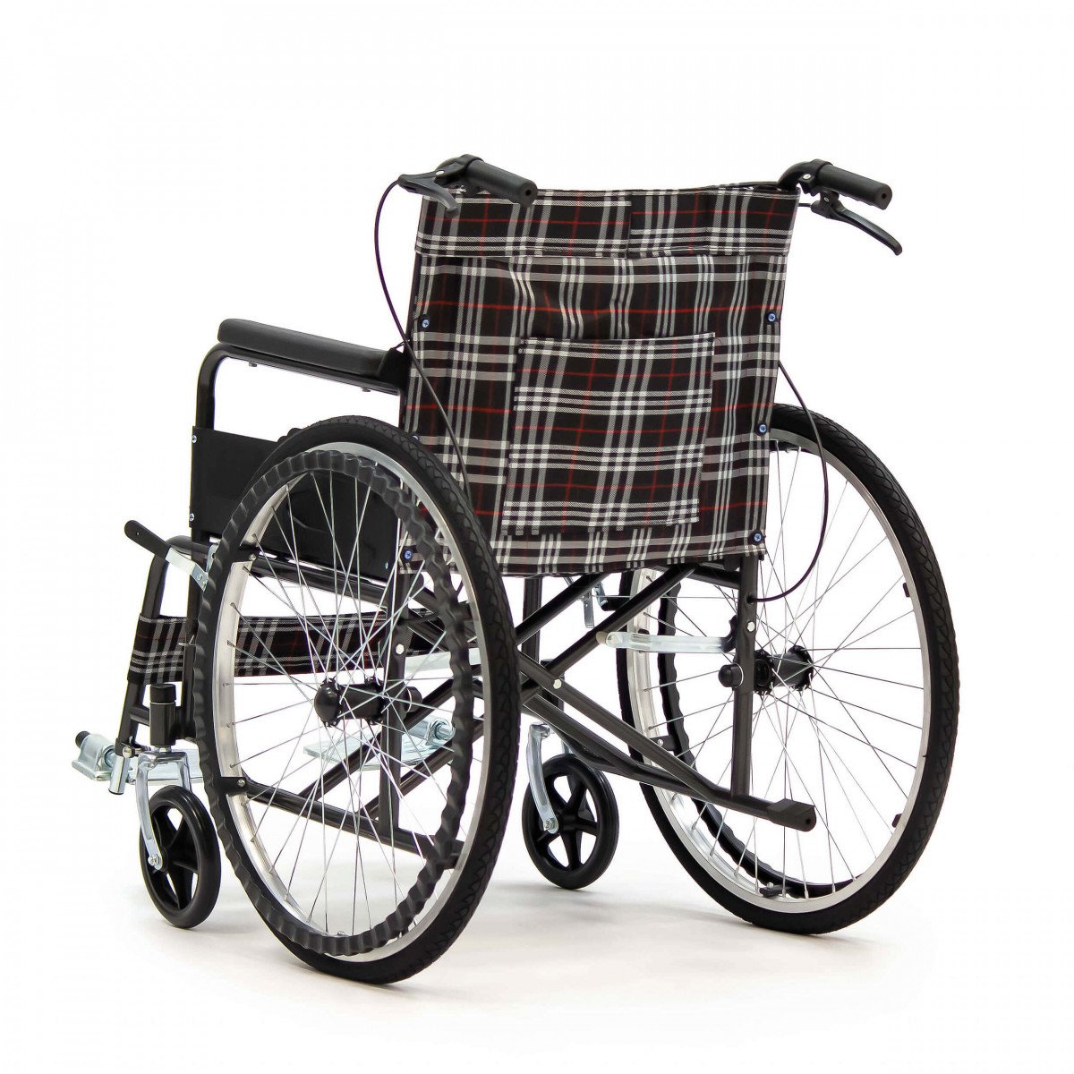 Конструкция простая и понятная в использовании. Сиденье выполнено из прочного полиэстера с водоотталкивающей пропиткой, подлокотники мягкие, а подножки регулируются по длине голени и дополняются поднимающимися опорами. Это позволяет настроить посадку и обеспечить комфортное положение пользователя. Рифлёные приводные обода упрощают управление, особенно если сила в руках снижена.