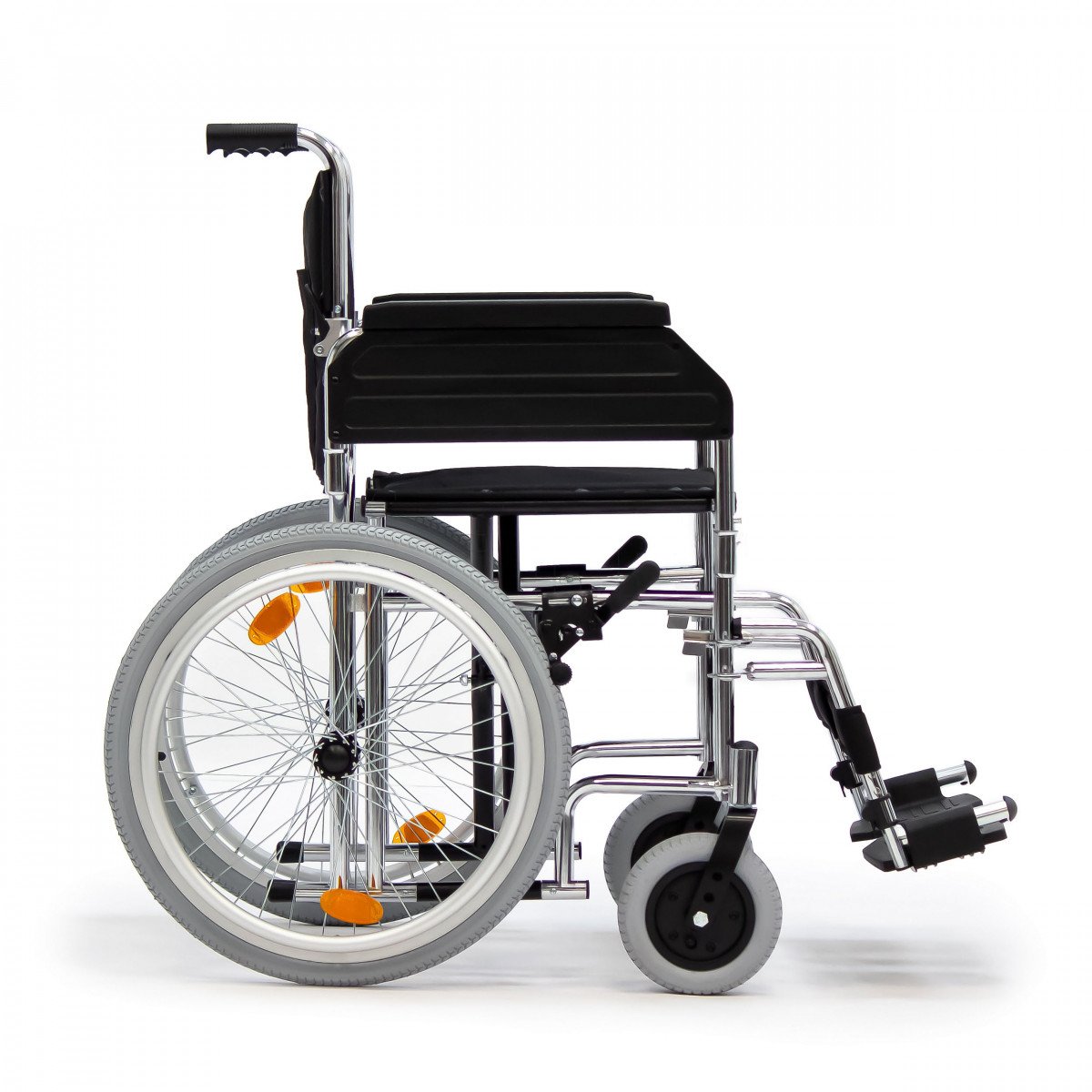 Модель подходит как для самостоятельного использования, так и для передвижения с сопровождающим. Скошенные подлокотники позволяют подъехать вплотную к столу и занять удобное положение. Коляска складывается вместе со спинкой, поэтому её удобно хранить дома и перевозить в автомобиле.