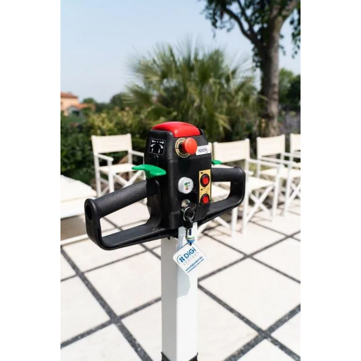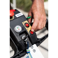 - Автоматический рычаг управления питанием с кнопками вверх и вниз, индикатор уровня заряда батареи и аварийный гриб
