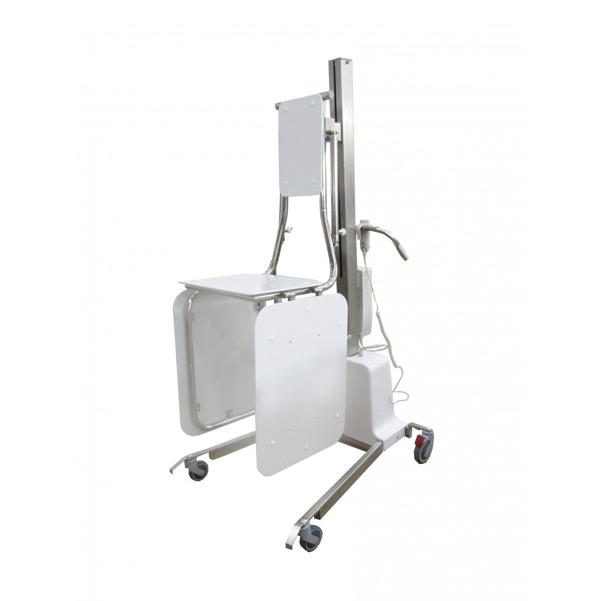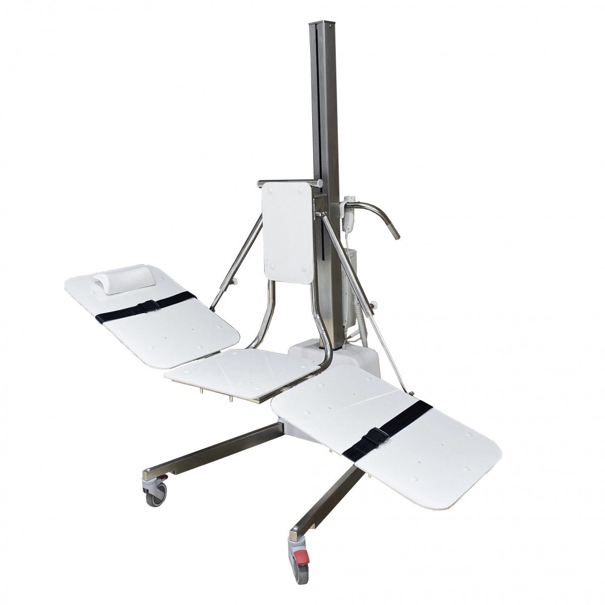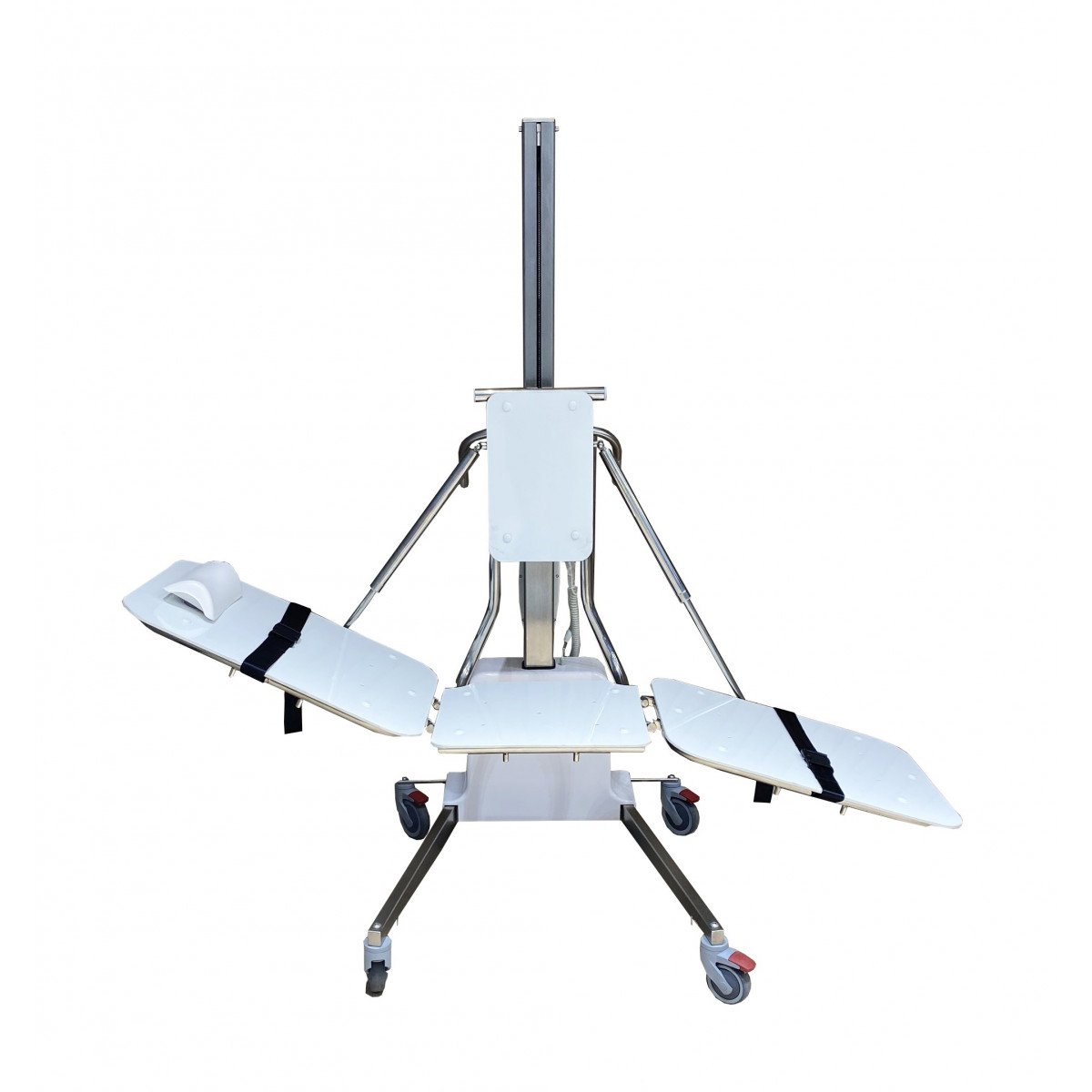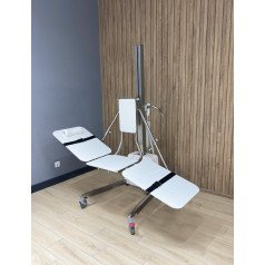 Конструкция выполнена на прочной металлической основе и оснащена подъёмным механизмом, который поднимает и опускает ложе нажатием одной кнопки. Трёхсекционная платформа регулируется по высоте и углу наклона, что помогает выбрать удобное положение для каждого пациента. Благодаря компактным размерам и маневренным колёсам подъёмник легко перемещается между помещениями, не занимая много места.