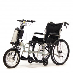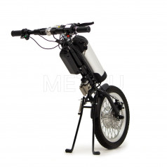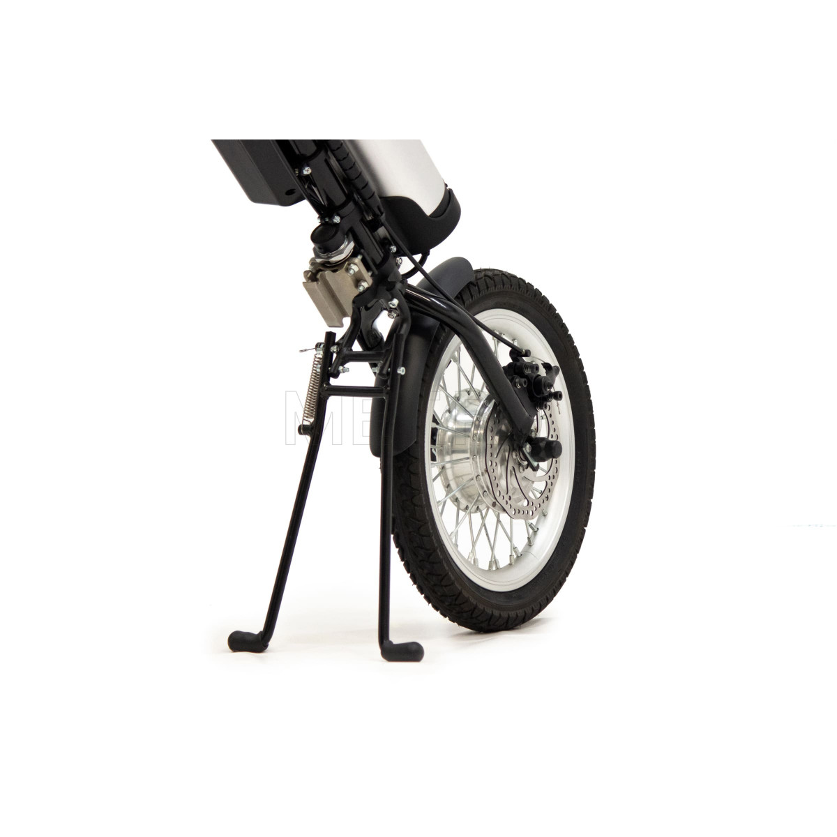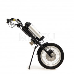 Электропривод включает в себя моторколесо с пневматической шиной, механический дисковый тормоз и систему крепления, которая удобно фиксирует его к подножкам вашей коляски и рулю, выполненному в мотоциклетном стиле. Для безопасных поездок в темное время суток предусмотрено мощное диодное освещение.
