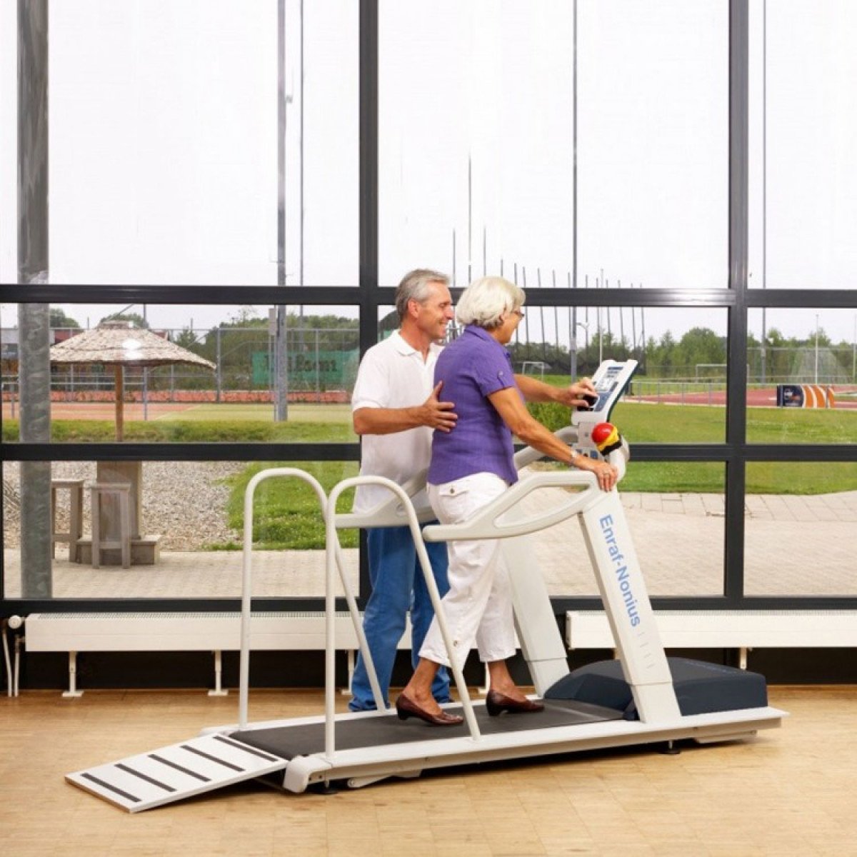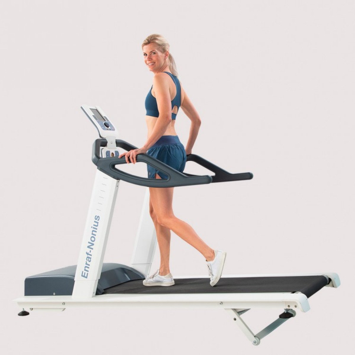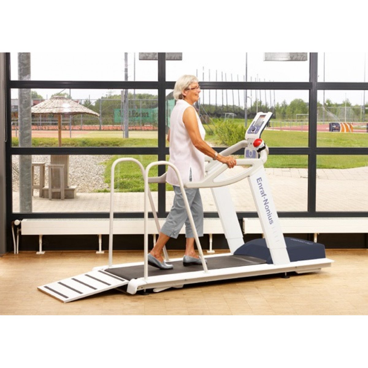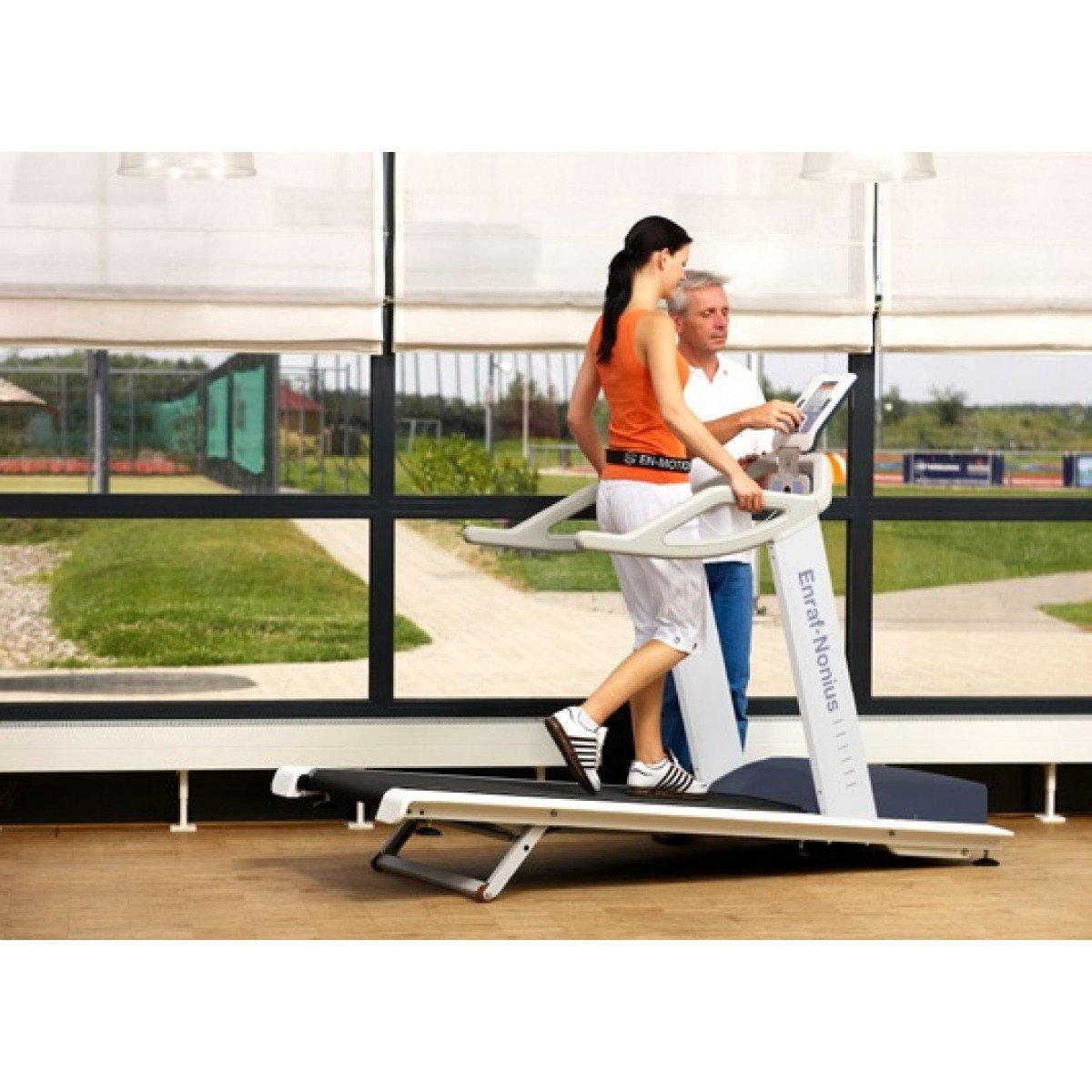 Реабилитационная беговая дорожка Enraf-Nonius Motion (Энаф-Нониус Моушн) предназначена для кинезотерапии и профилактики различных заболеваний, таких как кардиоваскулярные нарушения, диабет и остеопороз. Тренажёр регулирует скорость бегового полотна в зависимости от состояния пациента, автоматически останавливая его в случае сдвига и опасности падения. При возвращении пациента в правильное положение движение возобновляется. Пандус и поручни обеспечивают дополнительную безопасность для малоподвижных пациентов.