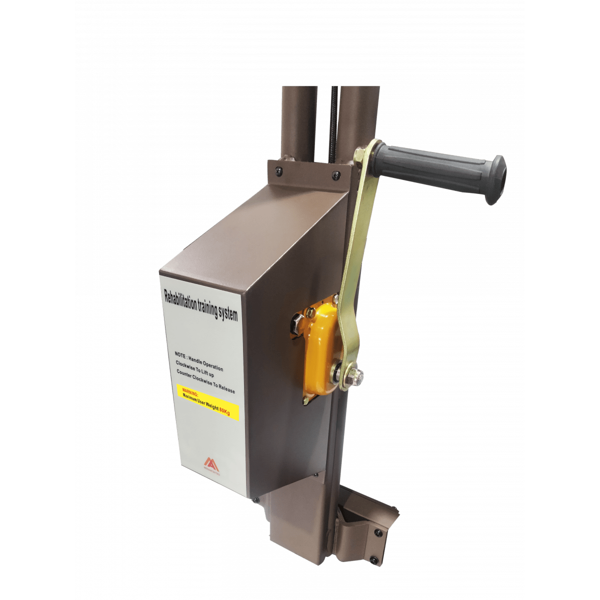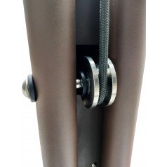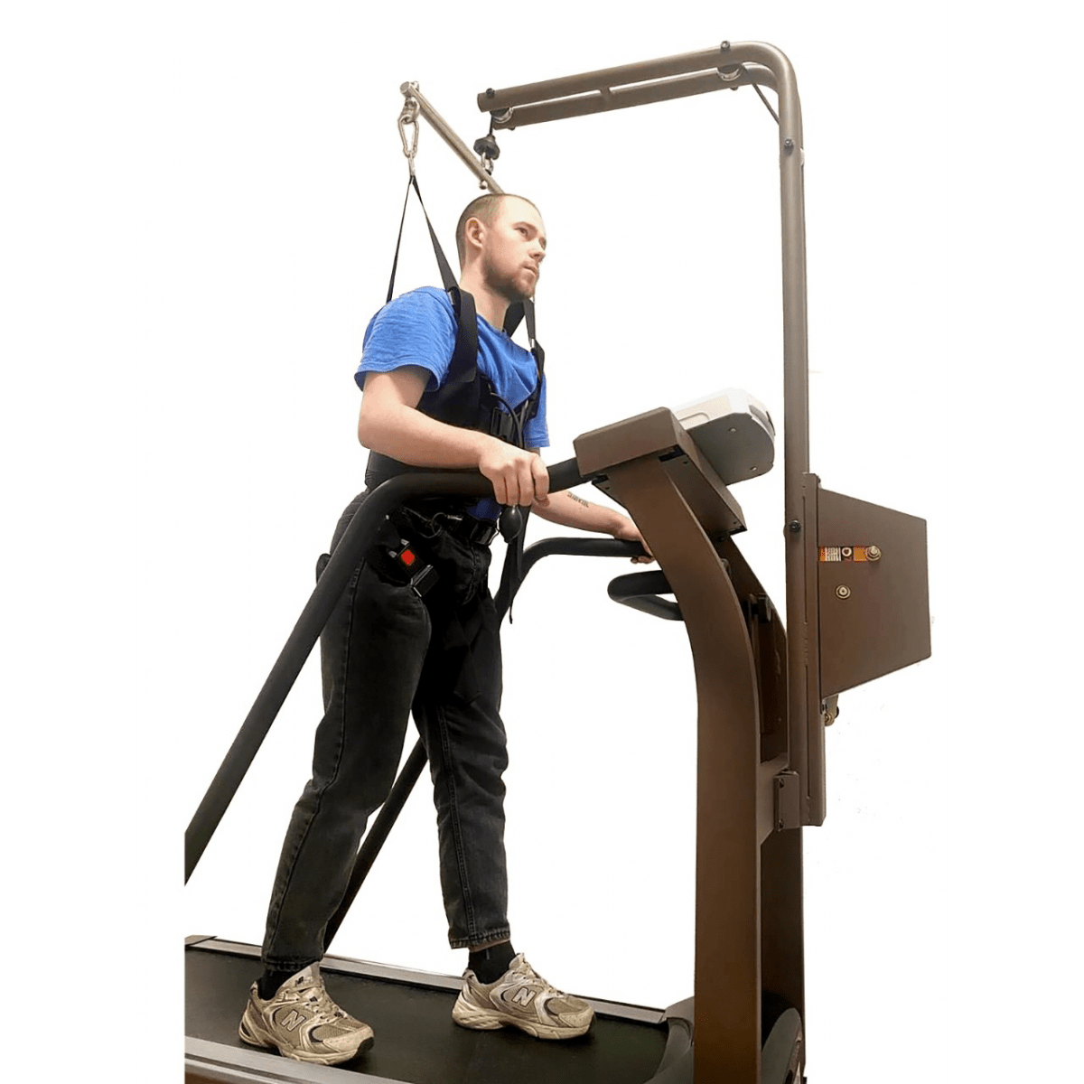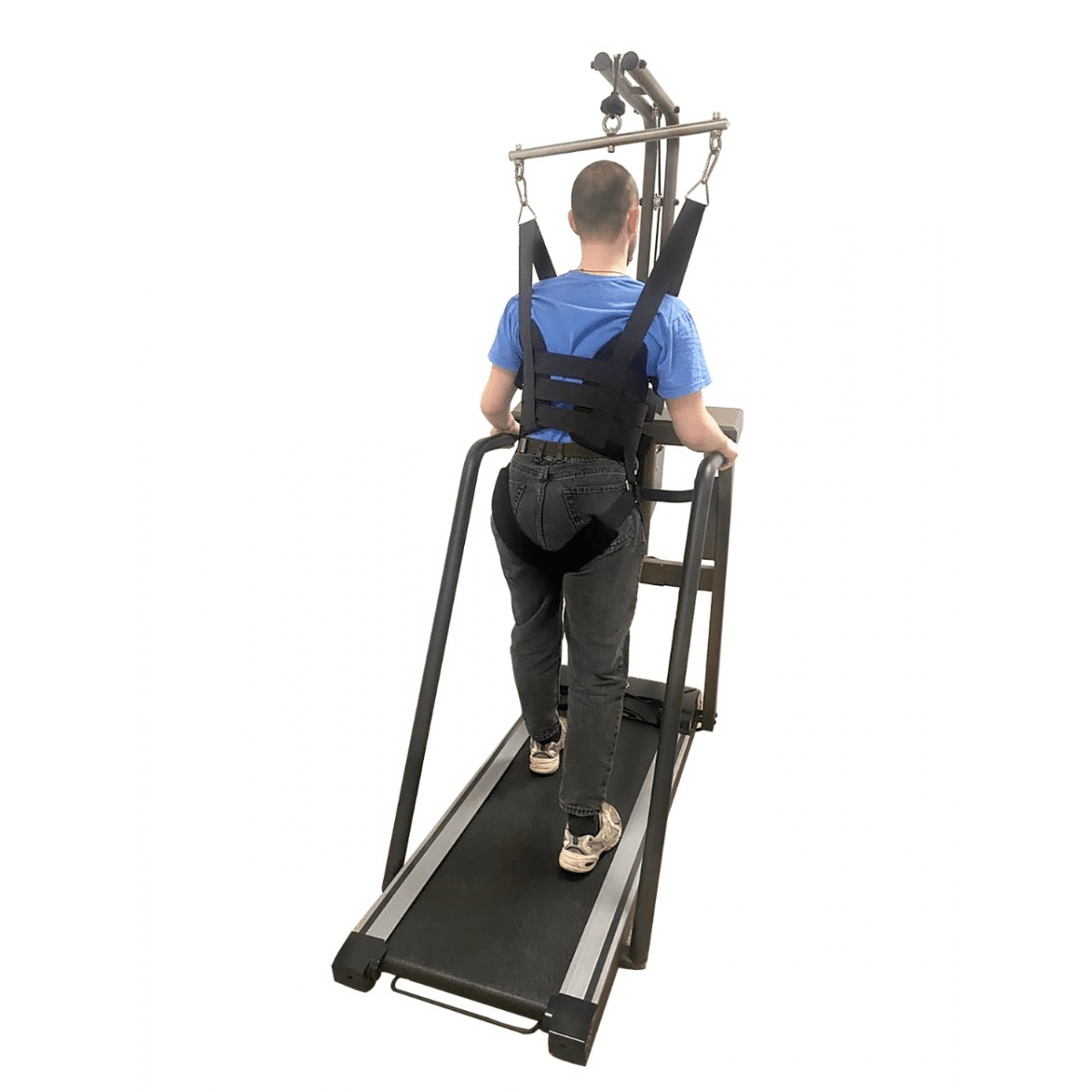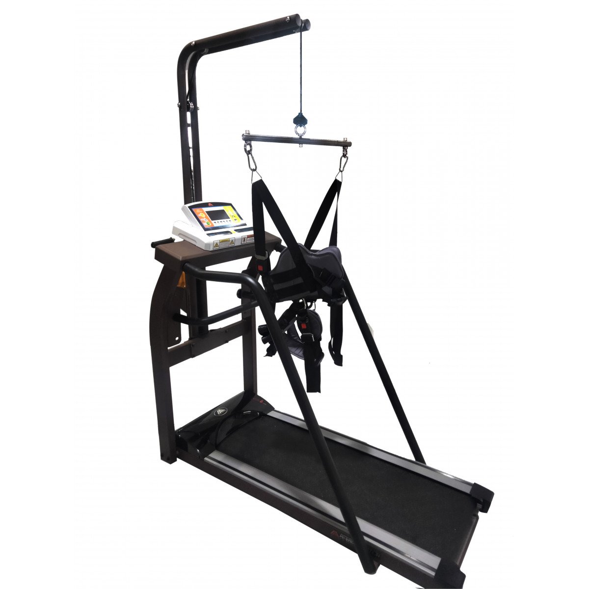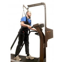 Регулировка подвеса осуществляется вручную — достаточно повернуть рукоятку. Крепление жилета можно установить на высоте 100–170 см от бегового полотна, что удобно для пользователей разного роста и возраста. При необходимости тренировки проводятся и без подвеса: мощный мотор выдерживает нагрузку до 120 кг, сохраняя плавность и устойчивость работы.
